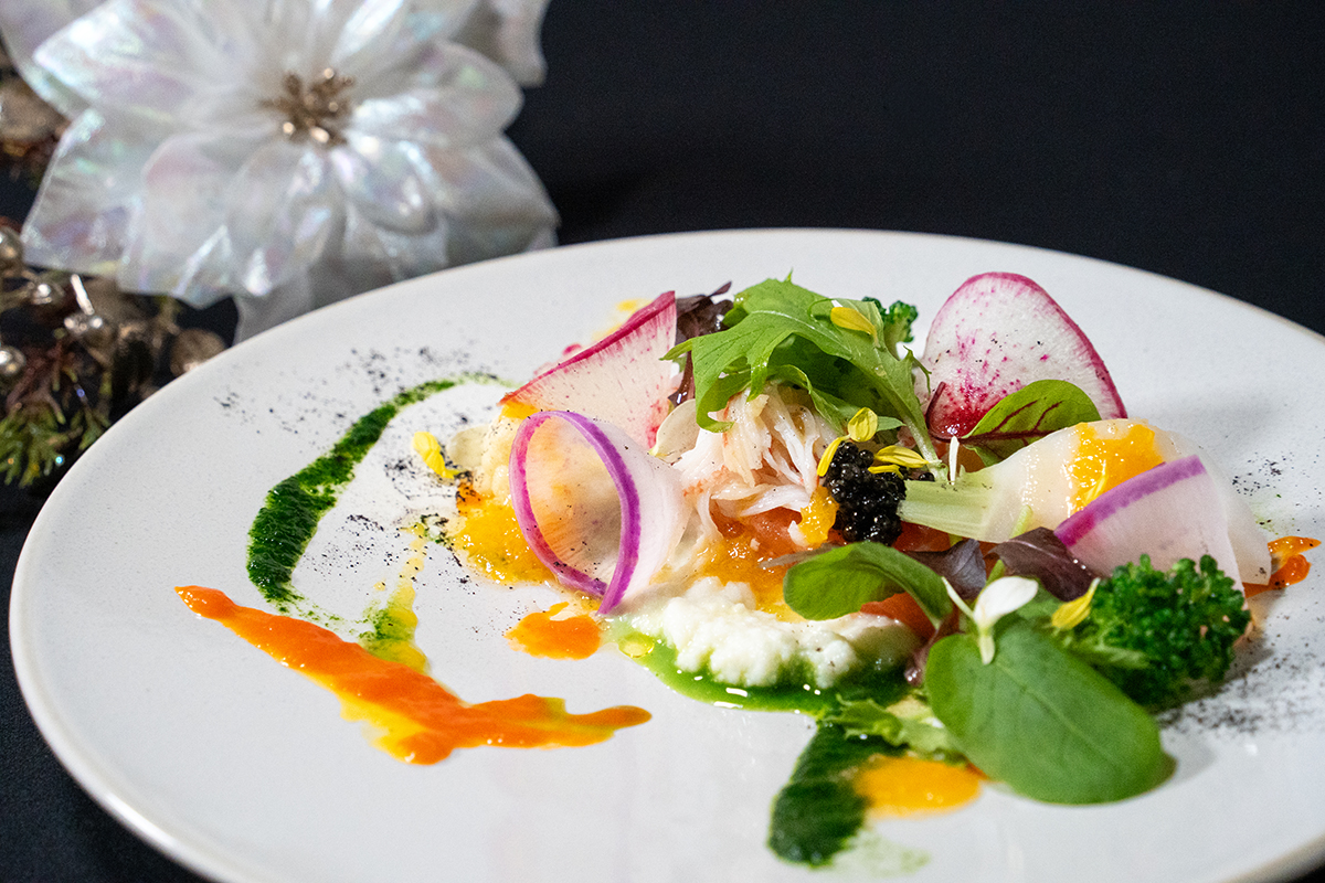 渡り蟹とふくいサーモンのマリネ カリフラワーのヴルテ キャビアと紅まどんな
