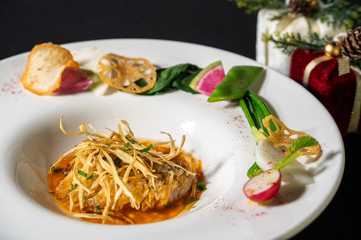 甘鯛のうろこ焼 魚介のカルドソと冬野菜