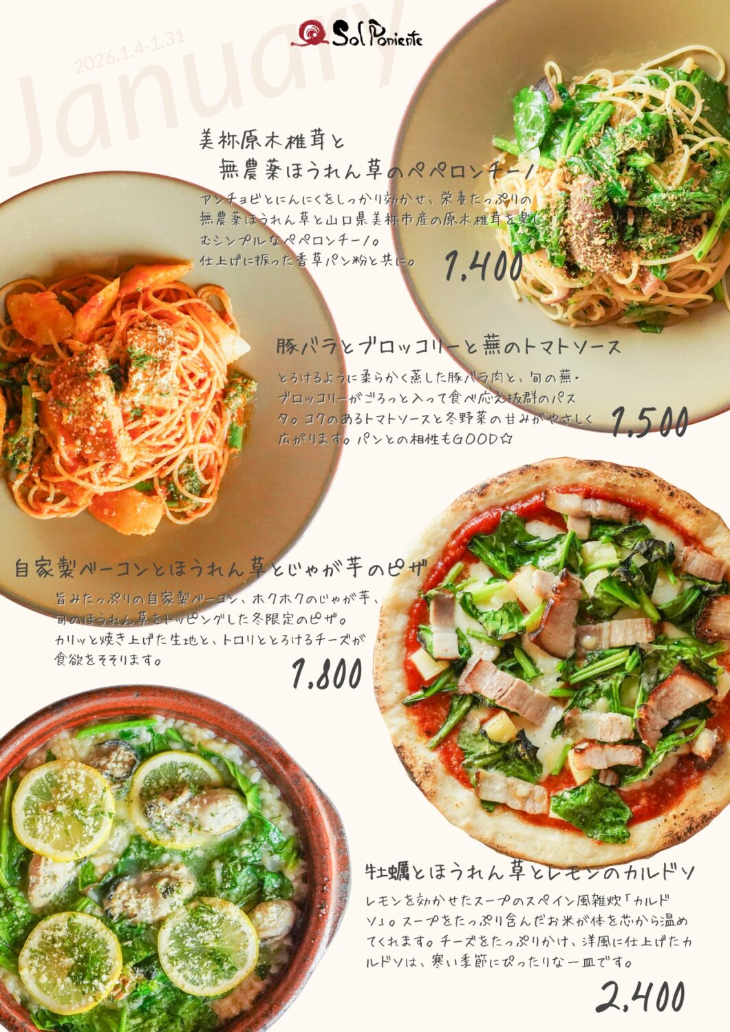 ソル・ポニエンテでは、冬の旬素材を贅沢に使ったあたたかみのある月替わりメニューをご用意しました。