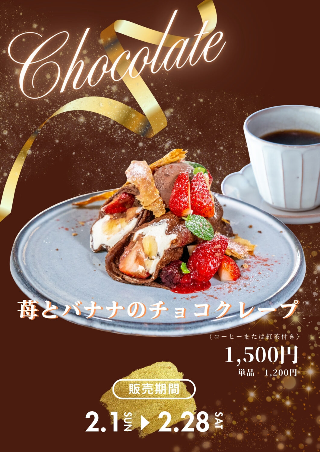 【苺とバナナのチョコクレープ(セット価格 1,500円)/単品1,200円】を提供いたします。