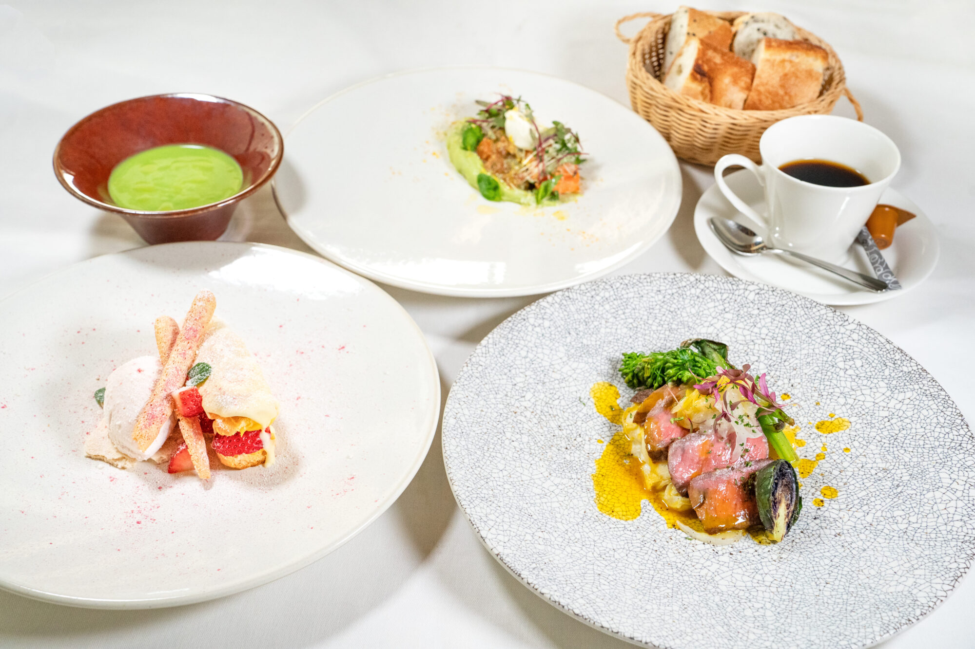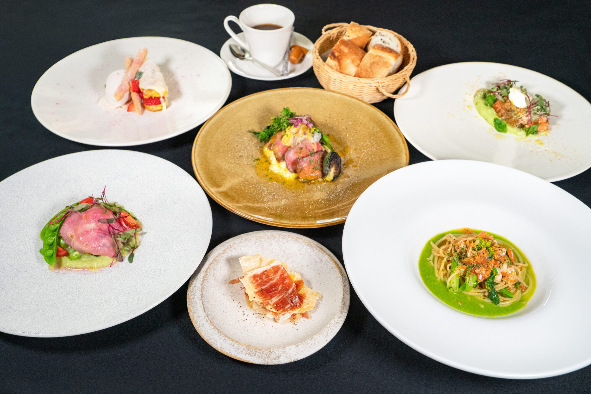 新玉葱、アスパラ、苺など、この時期ならではの旬の味覚を、一皿一皿丁寧に仕上げました。