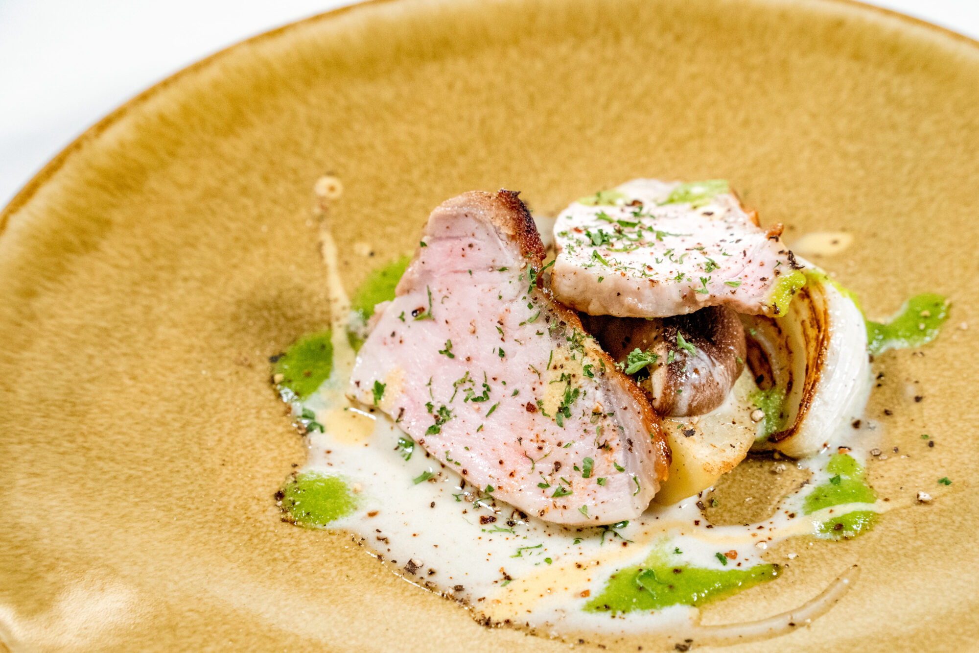 上質な脂の甘みが特徴のきなこ豚をじっくりとローストし、春が旬の新玉葱のローストとともに味わう贅沢な一皿。濃厚なゴルゴンゾーラのコク、アスパラの爽やかな香り、マスタードのアクセントが重なり合い、奥行きのある味わいを生み出します。素材の個性が調和する、春限定の肉料理です。