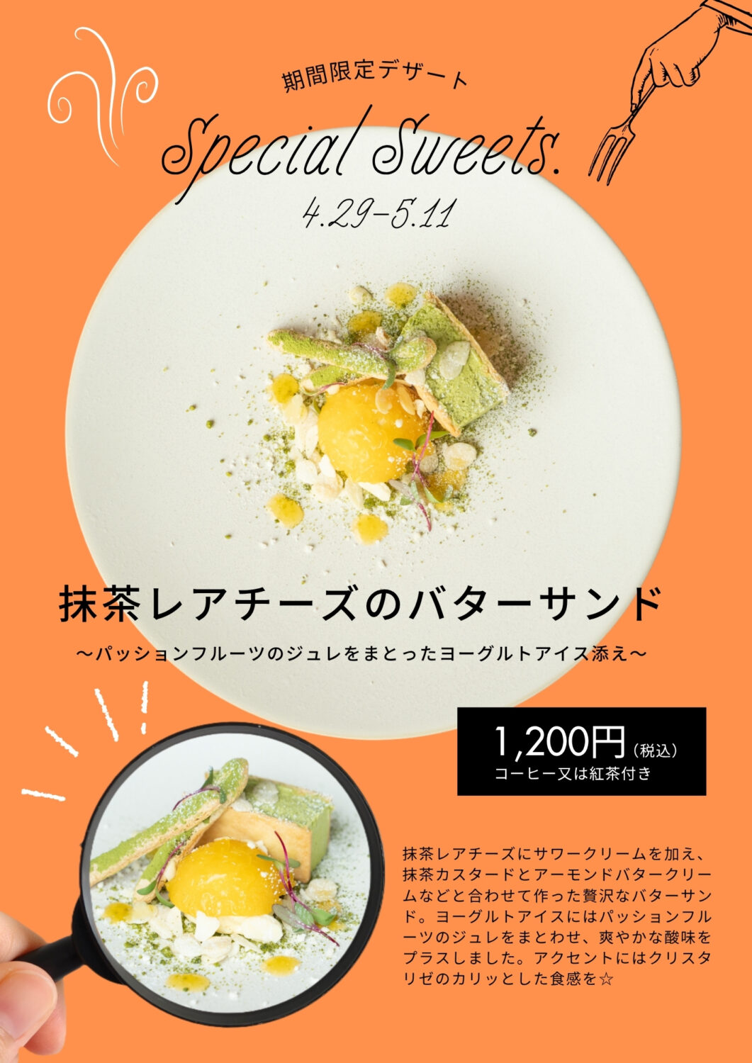 デザートに「抹茶レアチーズのバターサンド ~パッションフルーツのジュレをまとったヨーグルトアイス添え~」をご提供いたします。